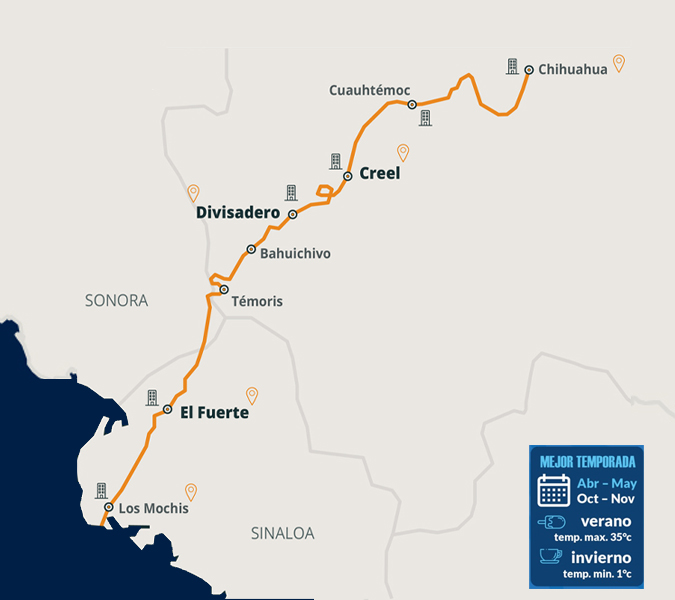 Las estaciones turísticas por las que pasa son: Cuauhtémoc, Creel, Divisadero, Posada Barrancas, Bauichivo, Temoris, El Fuerte, Los Mochis.